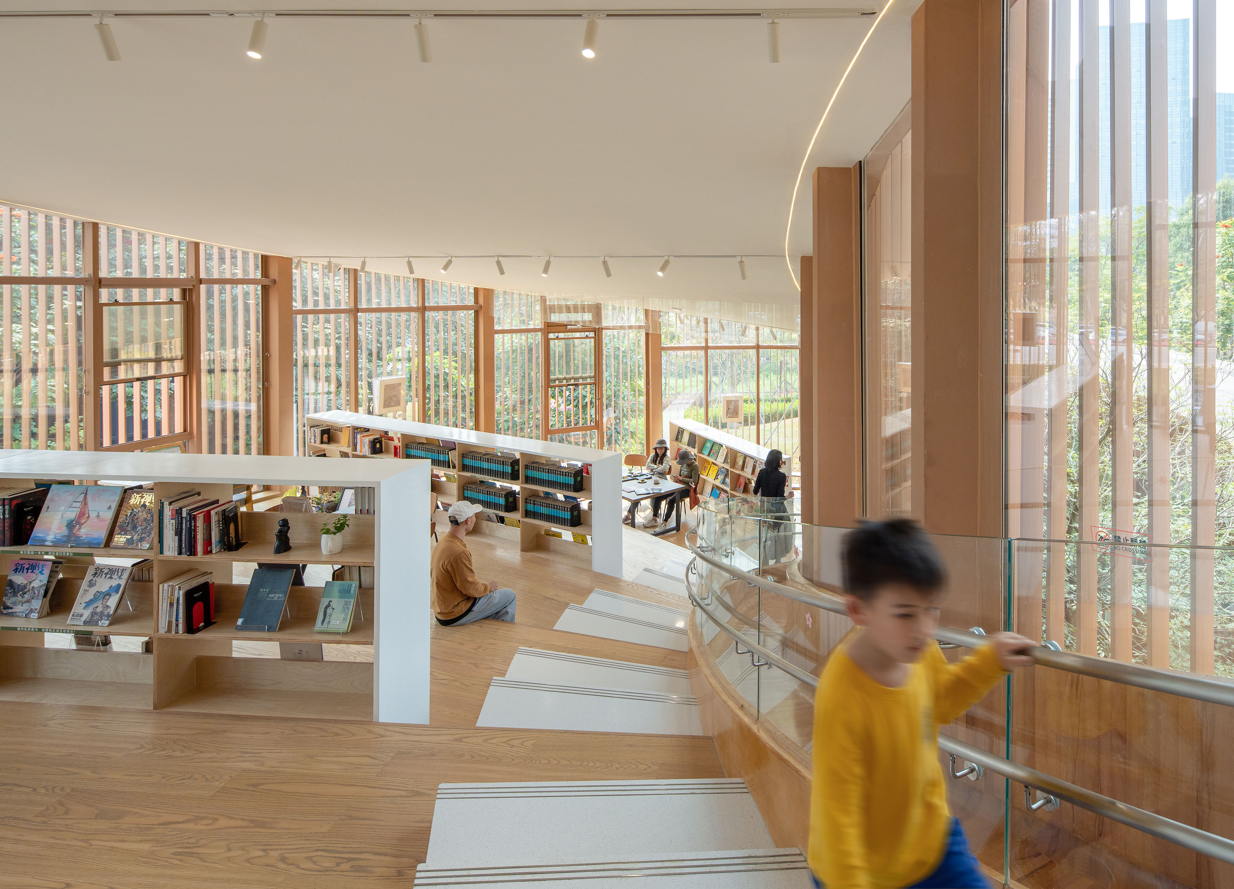 Serpentine Bookhouse 西臨大沙河沿岸景觀步道,北側為兒童遊樂場,東邊則是高密集住宅區,作為銜接兒童遊樂場與住宅社區的小型公共設施,Serpentine Bookhouse 特別規劃一座面積約 300 平方公尺的兒童主題圖書館。由 Atelier Xi (一樹建築)負責設計建造的 Serpentine Bookhouse,以盤旋向上的螺旋狀建築體,將地面空間盡可能保留給綠色植被,並且以漸次向上、望向樹梢的閱讀空間,營造出如同樹屋般的空間探索樂趣。螺旋建築體的上層盡頭,則是以落地窗和玻璃陽台,望向綠意盎然的公園。建築內則是順著螺旋結構,設計環繞著中庭樹木的閱讀階梯,以可上下攀爬的閱讀空間,以及環繞圖書館的360 度賞景視野,帶來激發想像、融入自然的自主學習氛圍。