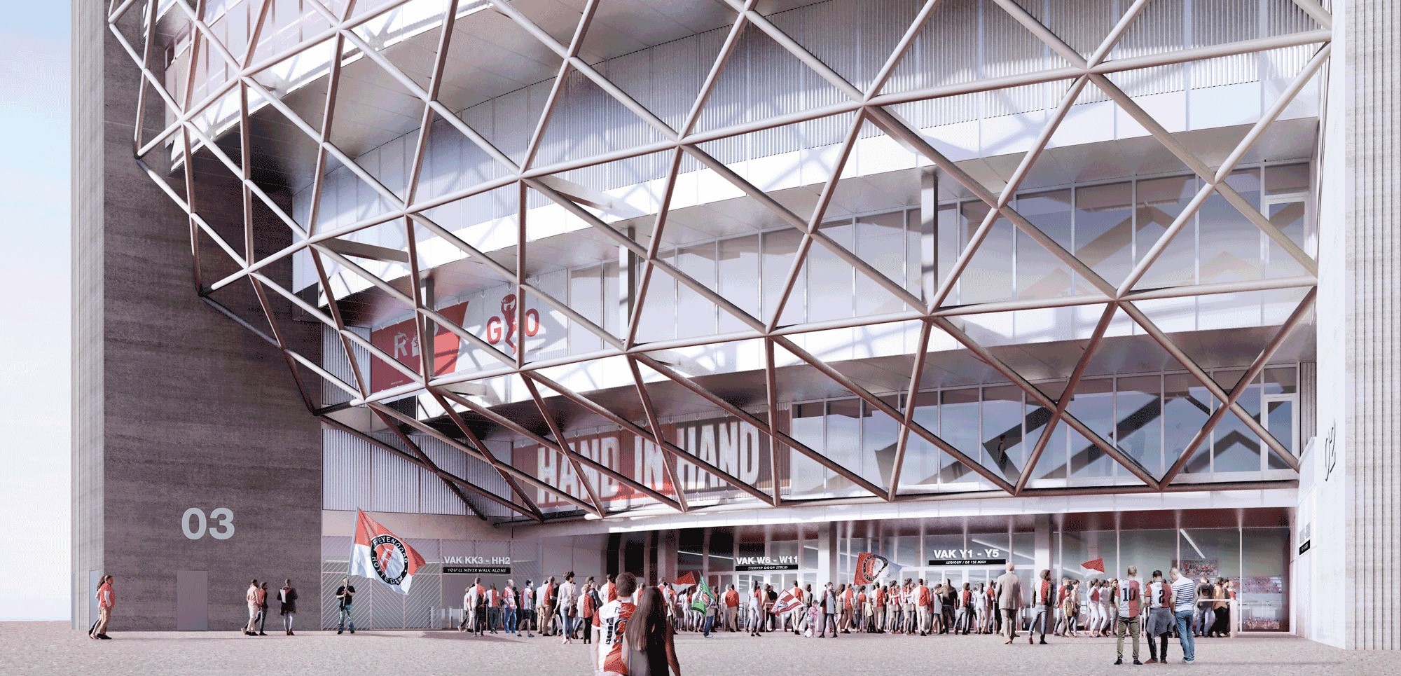 新 Feyenoord Stadium 在設計上,特別向具有時代意義的 De Kuip 採擷靈感,包含彎曲的懸臂支架和橢圓形盆狀球場造型等,都以進化版的設計延續到新球場中。為了有效減少鋼材結構的使用,OMA 特別以碗型鋼骨結構來優化球場設計,而展現現代化設計美感的新球場,也藉由碗型設計直接拉近看台與草坪賽場間的距離,所有坐位的角度視野也經過最佳化計算,讓球迷能夠更清楚、更近距離欣賞到一場場精彩的比賽。球場內也設計有最便捷流暢的行進動線,以因應未來大量到訪的人潮。規劃有三層式看台、共 63,000 個座位的 Feyenoord Stadium,在建成後也將成為荷蘭最大的一座足球場。
